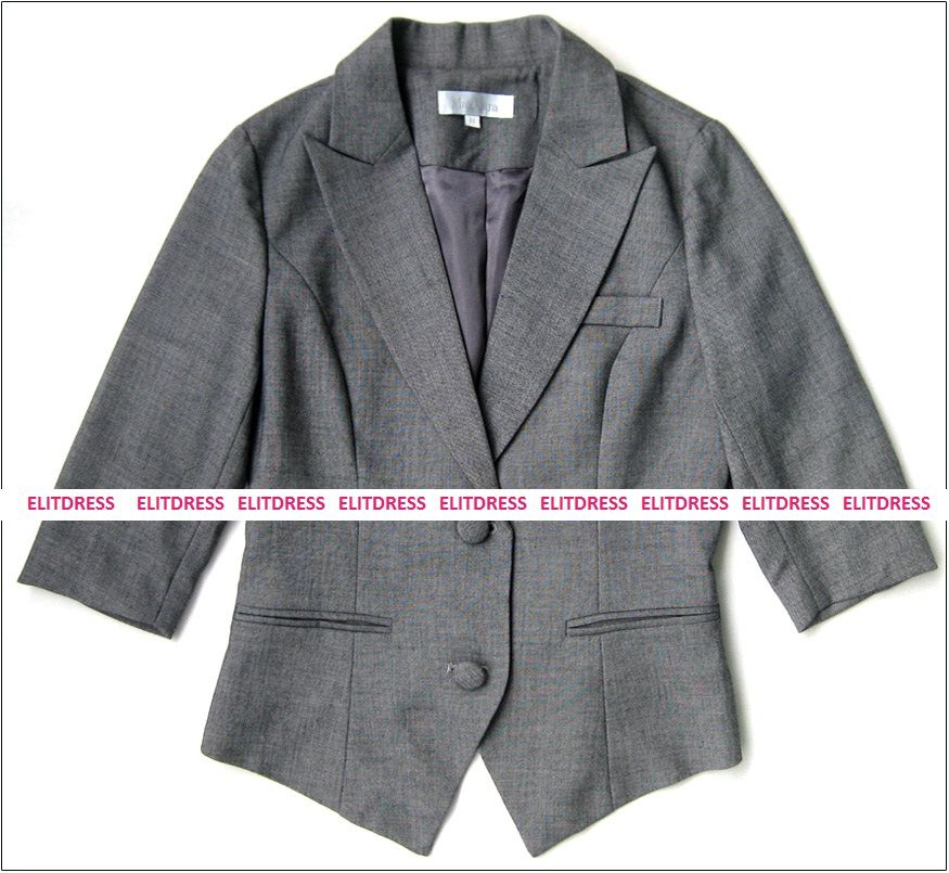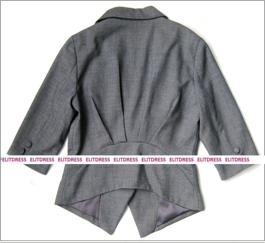 Жакет выполнен из высококачественного серого хлопка, с рукавами ¾. Модель приталенного покроя с асимметричным низом, сзади спинка короче чем перед, застегивается на две пуговицы, имеет отложной воротник, а также два кармана с клапанами и один нагрудный.
