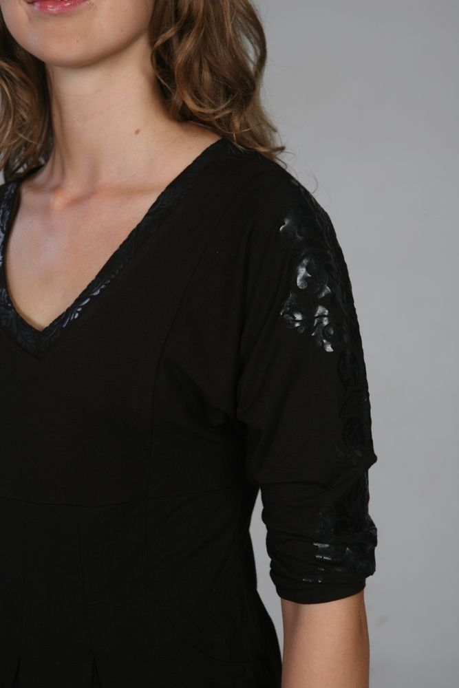 Интересная модель платья из вискозы черного цвета. Рукав длиной до локтя декорирован орнаментом. Так же украшен вырез-лодочка. Платье длинной до колена прямого силуэта смотрится элегантно, эффектно.