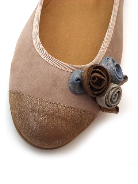 Мыс балеток выполнен из натуральной кожи бронзового оттенка. Модель украшена декоративным цветком из кожи. Подкладка, стелька из натуральной кожи. Каблук высотой 1см. Подошва - светлая резина с фиоменным логотипом.