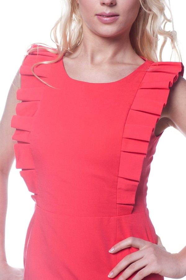 Платье-футляр кораллового оттенка, декорированное рюшами, лаконичное, но очень яркое благодаря исполнению в благородном красном цвете.