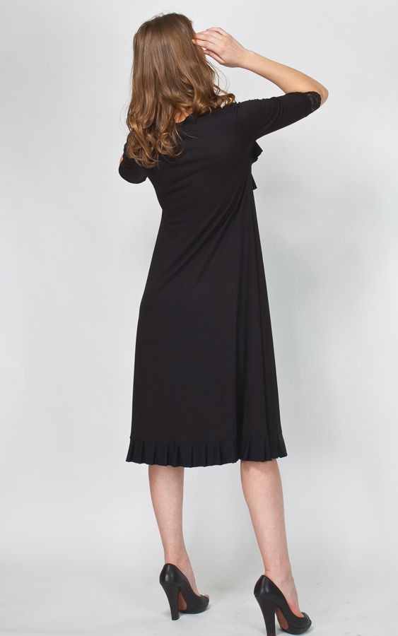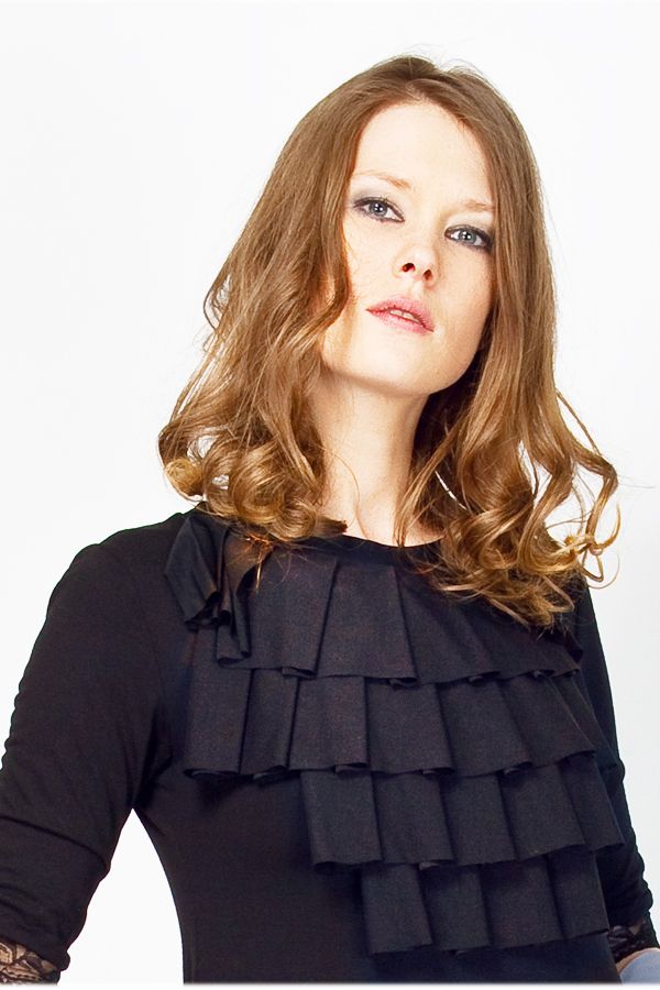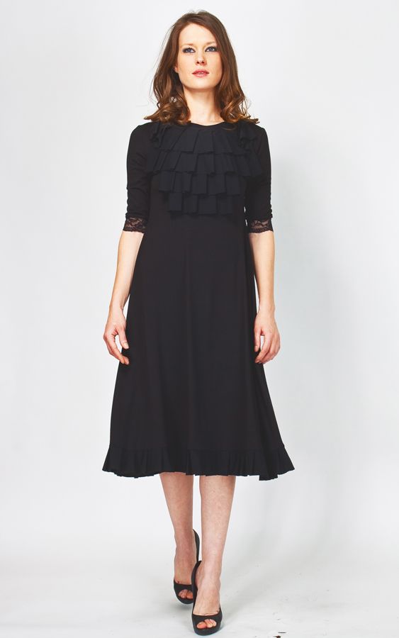 Женственное платье свободного покроя от творческого дуэта «Две сорванные башни» придется по душе всем представительницам прекрасного пола. Роскошный черный цвет сочетается с чем угодно. Элегантное жабо в сочетании с кружевными манжетами рукавов создают образ романтичной барышни. Главная примета весны – легкость кроя – выразилась в свободной юбке чуть ниже колена.