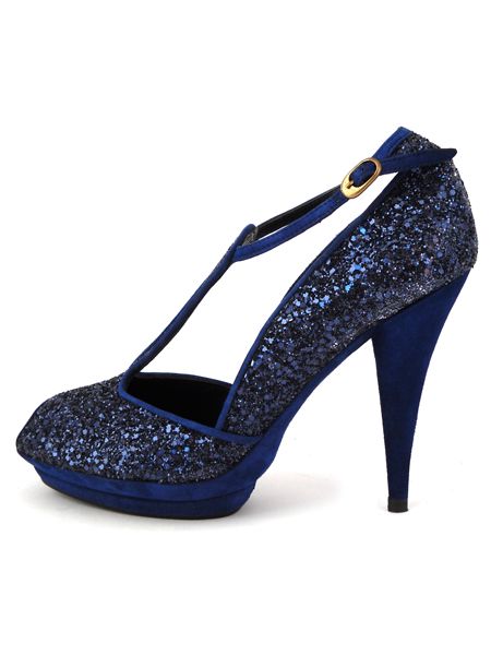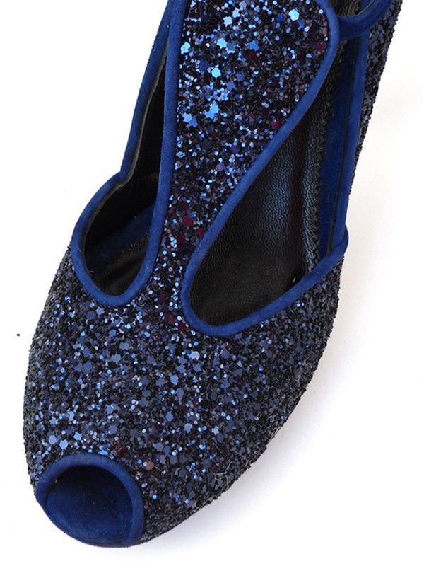 Верх туфель декорирован мелкими блесками (глиттер). Каблук высотой 11см обтянут синей замшей.