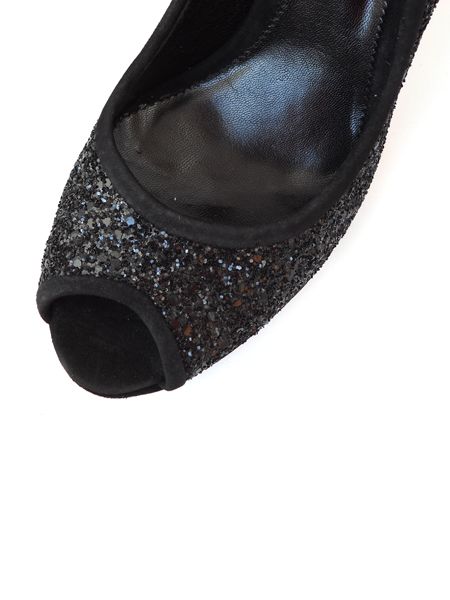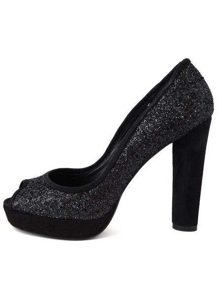Испанские дизайнеры соединили в этой модели классический силуэт и гламурный блеск. Верх туфель выполнен из материала глиттер (искусственный мерцающий материал). Небольшая платформа (2 см) и каблук (11 см) обтянуты черной замшей.