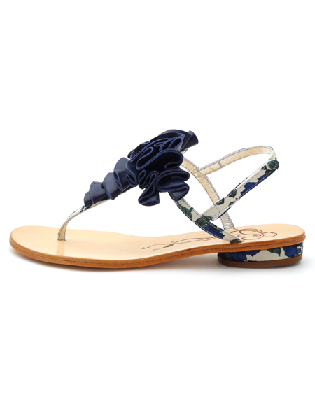 Именно так подумали испанские дизайнеры модной обуви, и в результате мы видим эти чУдные сандалии. Крупные воланы из натуральной кожи темно-синего цвета формируют пышное жабо. Отделка тканью с цветочным принтом добавляет образу романтический флер.