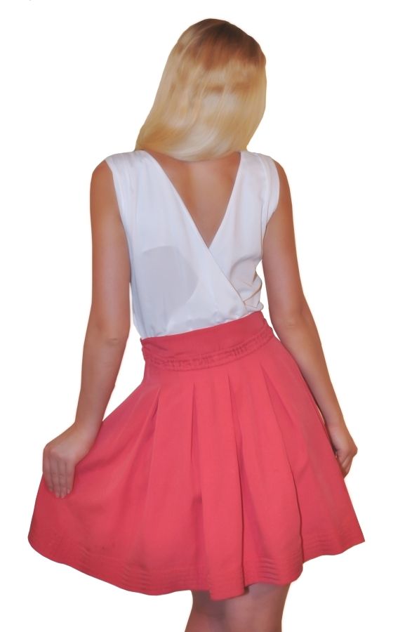 Очаровательное летнее платье с белым верхом из нежной вискозы и хлопковой юбочкой кораллового оттенка, декорированное тонким пояском - настоящая находка для девушки, во всём стремящейся к совершенству. Спинка с V-образным вырезом придаёт пикантности образу милой красавицы.