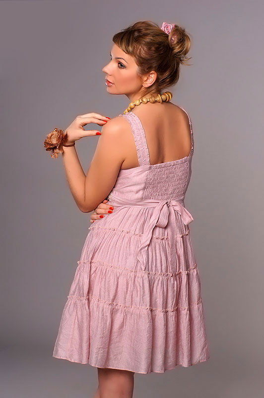 Лиф с запахом на декорированных бретелях, полоска с орнаментом под грудью, каскад воланов из лёгкого хлопка изумительного оттенка пыльной розы - все детали, несомненно, делают модель успешной.