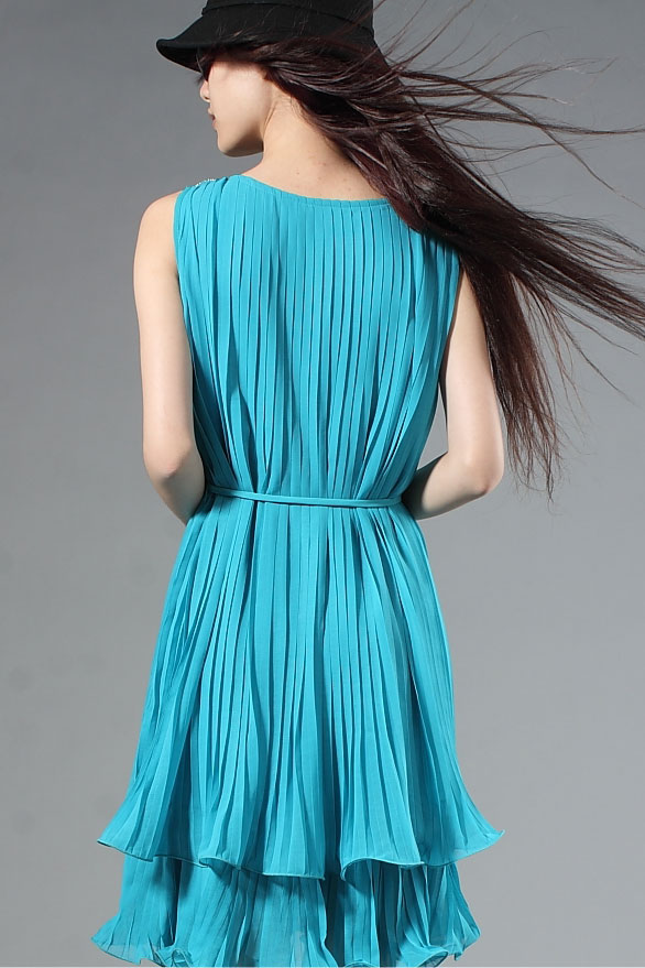 Выбор современной Афродиты - пена из воланов и плиссированный шёлк в голубой цветовой гамме. Эффект лёгкости и элегантной женственности подчёркивается при помощи тонкого пояска с металлическими элементами, формирующего приталенный силуэт. Украшения в форме монеток, окаймлённых серебристой нитью - оригинальная деталь, делающая модель желанной и очаровательной.