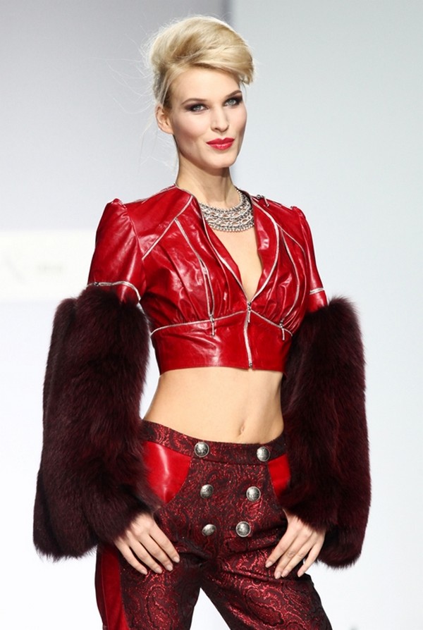 Куртка выполнена из прекрасной ярко-красной кожи и сложно декорирована серебряными вставками и молниями. «Изюминкой» модели являются роскошные съемные рукава из шикарного меха финского песца.