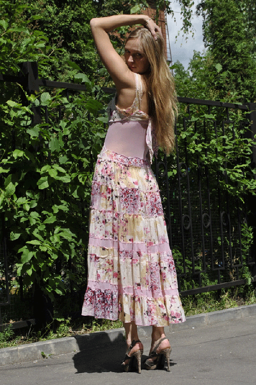 Яркий принт на легчайшем батисте пастельного оттенка, затейливый крой пышной юбки, точёный силуэт - всё кружится в бесшабашном танце летних цветов!