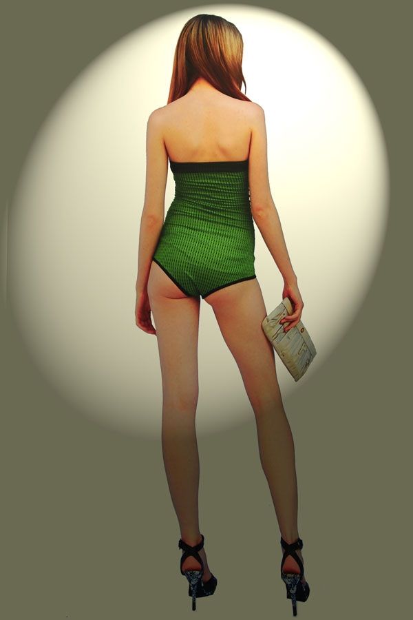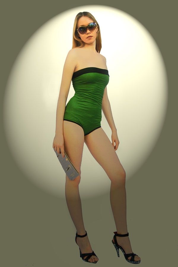 Купальник «Зеленая волна» создан из двухсторонней ткани: черной и зеленой, что позволит вам менять ваш образ в соответствии с настроением. Черная сторона боди-купальника украшена зеленой вставкой на декольте, а зеленая сторона окантована черной.