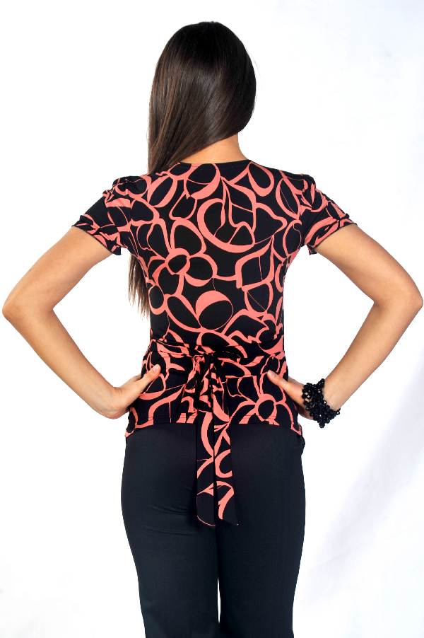 Трикотажная блуза сразу же бросается в глаза своим красивым рисунком, который делает ее очень стильной и привлекательной. Приталенный силуэт модели придаст вам женственной элегантности, а глубокий вырез декольте, обработанный планкой, выгодно подчеркнет красоту вашего бюста.
