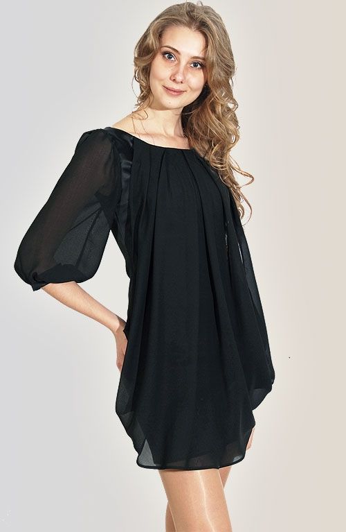 Двухслойной черное платье создано из шифона и атласа. Модель прилегающего силуэта невероятно эффектно и оригинально смотрится благодаря шифоновой драпировке на передней полочке, которая делает ее очень изысканной. Укороченный стильный рукав из шифона прекрасно дополняет платье.