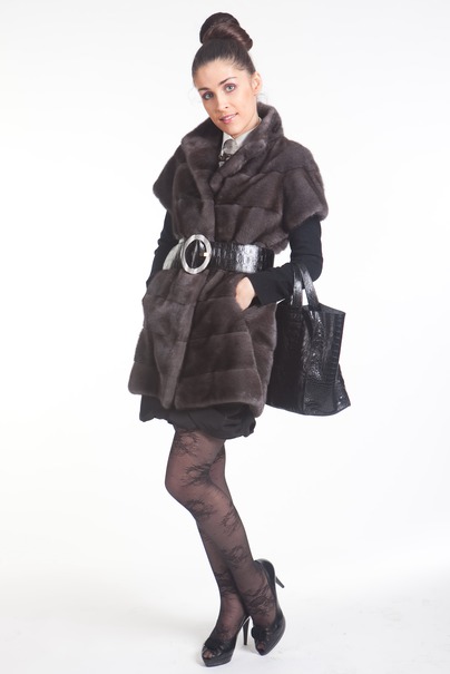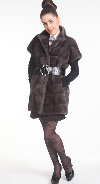 Длинный жилет из норки с новым цветом-хамелион. Такой цвет при различном освещении меняется от темно-серебристого до шоколадного. В этой модели использован метод поперечной раскладки меха. Шуба очень теплая и при этом легкая. Такой раскошный жилет прекрасно смотрится как с поясом, так и без него. Длина модели 80 см.
