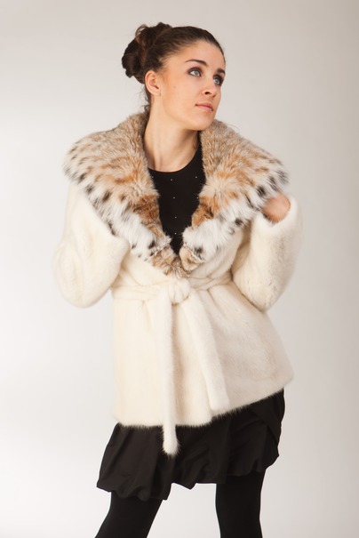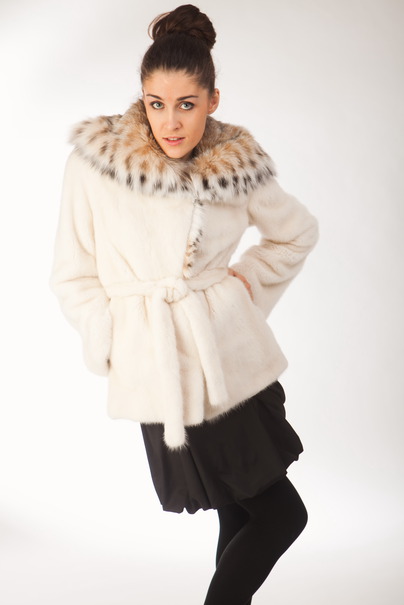 Эта модель очень теплая и практичная при носке, но в то же время выглядит роскошно. Для этой шубы использовался мех кремовой скандинавской норки цвета pearl. Большой капюшон из меха рыси bob cat придает изделию еще более дорогой вид. Длина изделия 75 см.