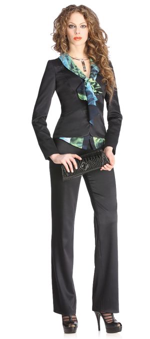 Это именно то, что вы искали! Брючный костюм, который подойдет и в качестве ежедневного офисного наряда, и как вариант для делового ужина с важными партнерами. Идеально подобранные силуэты брюк и жакета, выполненных из благородной ткани изысканного цвета с красивым, но не кричащим отливом дополняются блузой в сине-зеленых тонах, которая выгодно оттенит и освежит ваш образ. А игривый бант, завязанный на груди, не позволит забыть о том, что вы еще и просто красивая женщина!