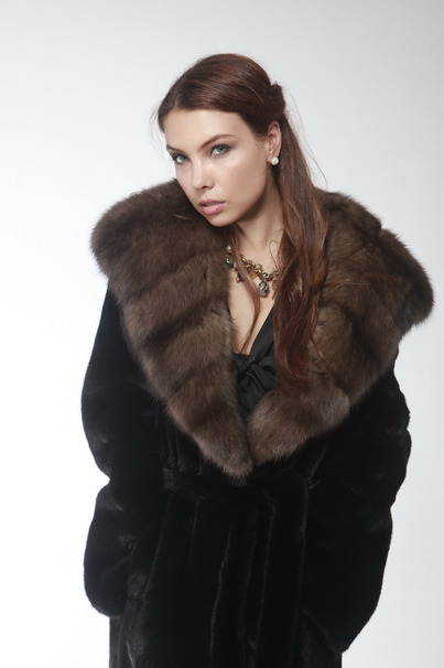Лучшее и самое дорогое сочетание мехов в классической модели. Шкурки норки использованы в форме пластин. Мех соболя имеет натуральный цвет, без тонировки, с сединой. Длина мехового пальто 115 см.