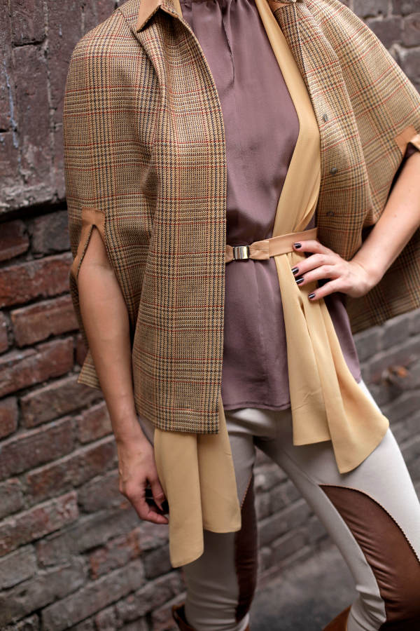 Ничто так не скрывает недостатки и не подчеркивает все достоинства как пончо, особенно если оно выполнено из бежевой шерсти в ультрамодную клетку с кожаными вставками на вороте и рукавах.