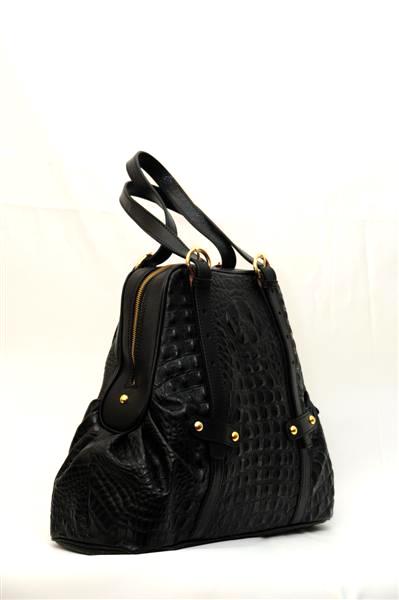 Кожаная сумка, выполненная в виде крокодильей кожи, чем-то по своей форме напоминает маленький и аккуратный рюкзак. По всей длине лицевой части сумки проходит два тонких кожаных ремешка, которые потом переходят в удобные ручки для носки сумки.