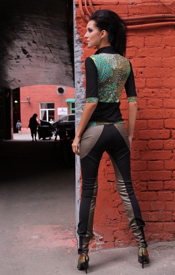 Очень интересное сочетание принта изумрудных оттенков, напоминающего переливы то ли драгоценных камней, то ли яркого павлиньего хвоста, подчеркнутого глубоким черным цветом сразу привлекает внимание. А модный воротник-поло и рукава ½ отлично подходят активной и стремительной девушке, которая обязательно должна быть в центре событий и внимания!