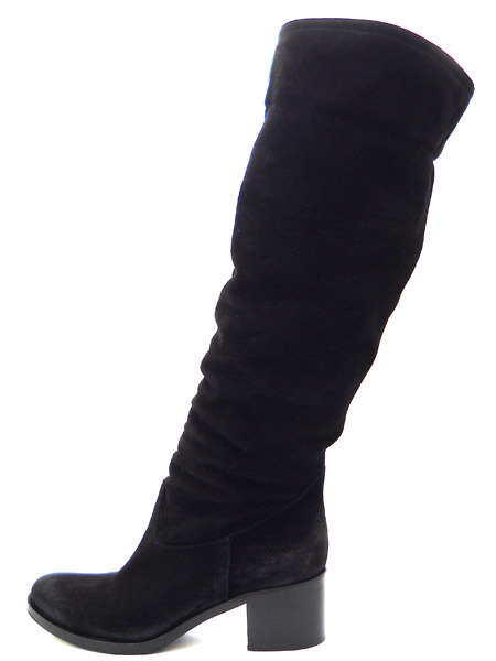 Замшевые сапоги черного цвета с присборенным голенищем дополнят Ваш образ и сделают его еще женственнее и элегантнее.