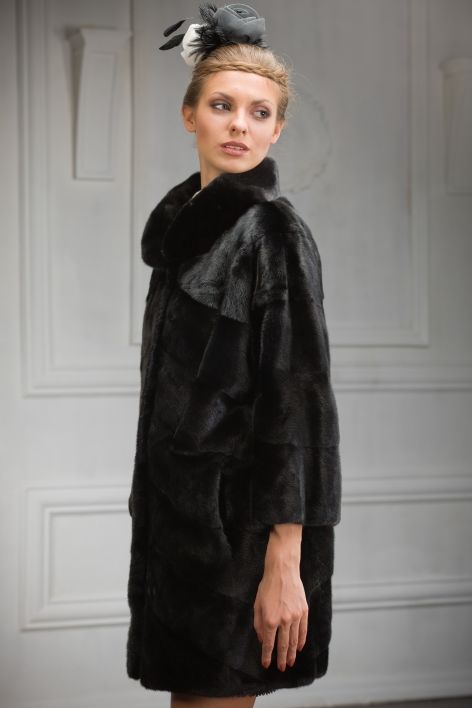 Модель создана в элегантном и изысканном стиле 20-х годов: слегка зауженный низ, рукав-летучая мышь, оригинальный воротник-стойка. Особую эффектность шубе придает диагональная раскладка меха, которая делает акцент на безупречной красоте густой и бархатной коротковорсной норки.