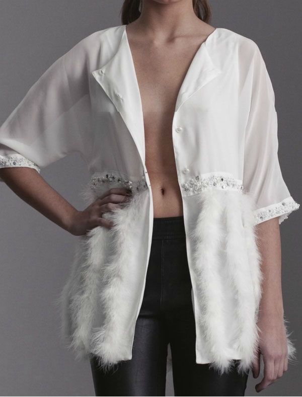 Эта роскошная белая блуза – настоящее произведение искусства. Белоснежный шелк в сочетании с жемчужным бисером и шикарным белым мехом смотрится просто превосходно. Удлиненный силуэт, короткий рукав, изысканный ворот – все в ней наполнено женственностью и романтизмом.