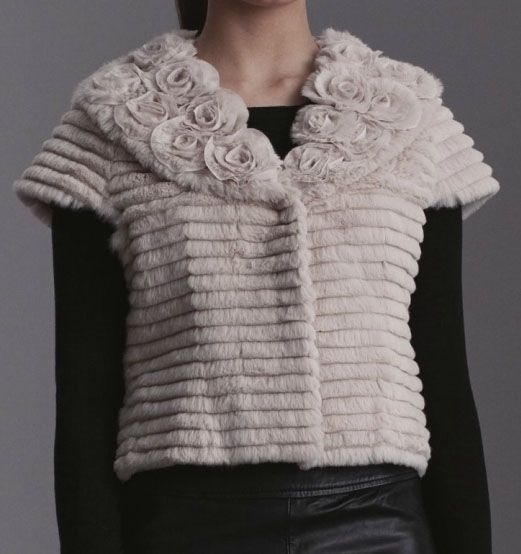 Шикарный мех нежного пудрогого цвета нашит на трикотажную основу тонкими полосами, что делает жакет очень изысканным и утонченным, а потрясающая отделка широкого воротника шифоновыми розами придает модели особую роскошь и дорогой вид.
