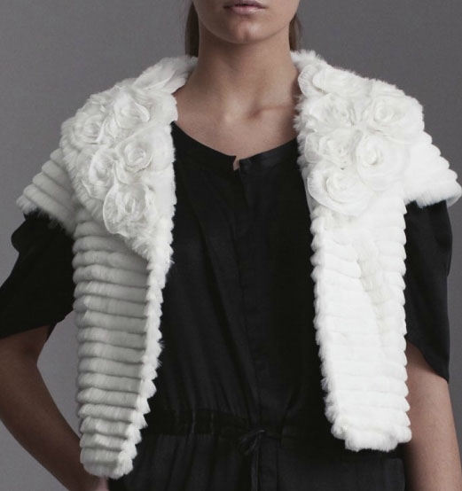 Короткий жакет создан из шикарного белого меха, нашитого полосами на натуральную трикотажную основу. Особой «изюминкой» модели является умопомрачительный большой воротник, украшенный крупными шифоновыми розами, который бесподобно сочетается с рукавами-крылышками.