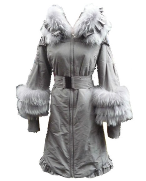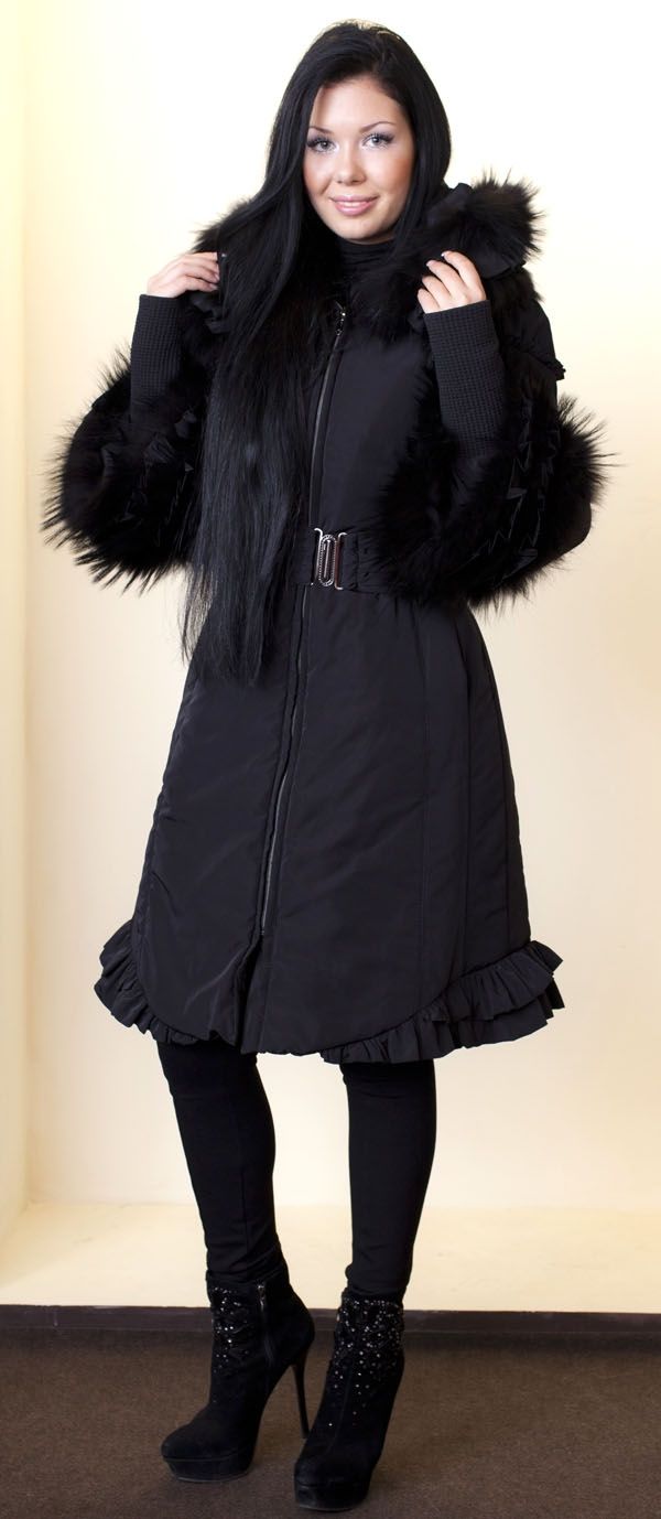 Модель бесподобно смотрится благодаря своему сложному дизайну. Пальто силуэтного покроя с чуть расклешенной юбкой, декорированной эффектной оборкой. Особая «изюминка» модели - это ее потрясающие рукава, состоящие из двух частей: широкий рукав ¾ отделан роскошным натуральным мехом, а изнутри к нему пришит трикотажный рукав-резинка.