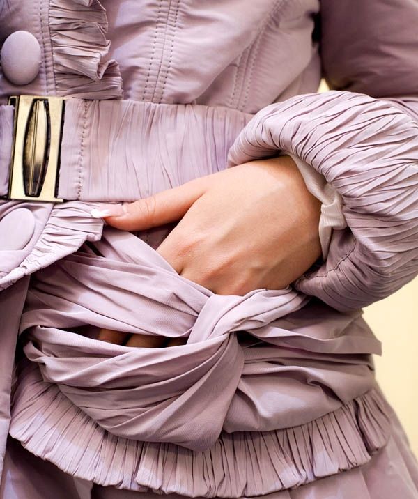Куртка силуэтного покроя с расклешенным низом создана из материала, цвет которого искрится на солнце. Модель вся состоит из уникальных элементов: рюшей и оборок, оригинально декорированных карманов, эффектной отделки рукавов – настоящий эксклюзив.
