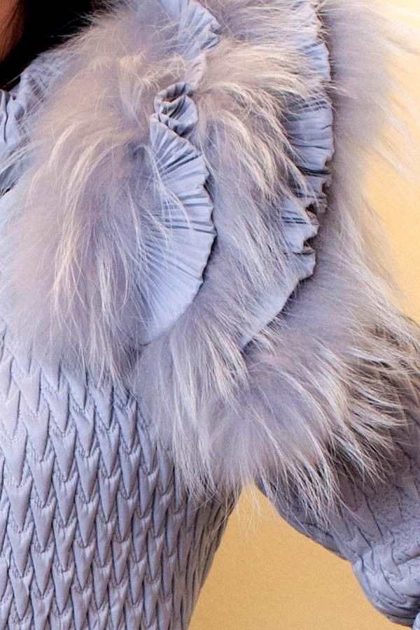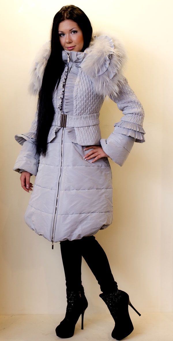 Глядя на эту модель невозможно не отметить талант и изобретательность дизайнеров, ведь она вся состоит из сложных и оригинальных элементов. Роскошный капюшон с рюшами и потрясающей меховой отделкой, великолепное сочетание стеганого жакета-обманки с гладкостью основной ткани, эффектное оформление рукавов – все это верх изящества и вкуса.