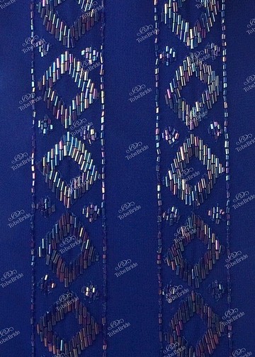 Благодаря двойной линии, которая создаётся путём вышивания бисером, и проходит по середине вдоль всего платья, обладательница этого наряда визуально кажется стройнее и грациознее. Особенностью этого платья является широкая сплошная линия, вышитая бисером, которая идёт по подолу платья.
