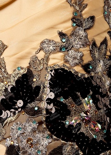 Корсет украшен многочисленными узорами, созданными при помощи машинной вышивки. Несколько ярких камней придают ему пикантности. Узор плавно переходит на верхнюю часть спины через левый бок. С левой стороны, на талии имеется крупный веер из шёлка, который делает платье необычным и удивительным.