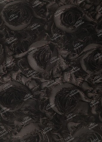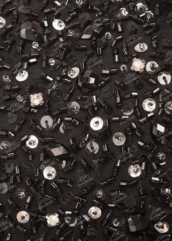 Корсет с левой стороны украшен мелкими горизонтальными драпировками. На правой груди красуется небольшая аппликация из мелких камней, пайеток и бисера. На левом плече имеете широкая чёрная бретель, выполненная из нескольких слоём лёгкого фатина.