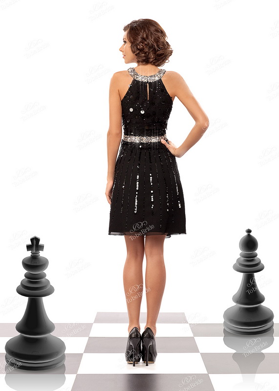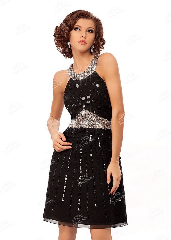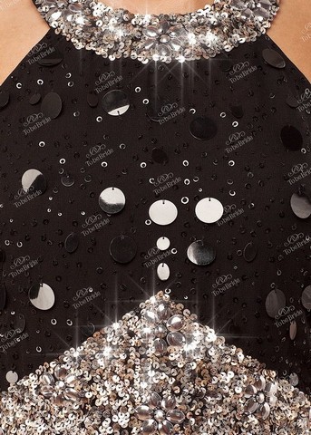 Платье полностью вышито пайетками и бисером, поэтому оно будет сверкать при любом освещении. Длина платья – чуть выше линии колен.