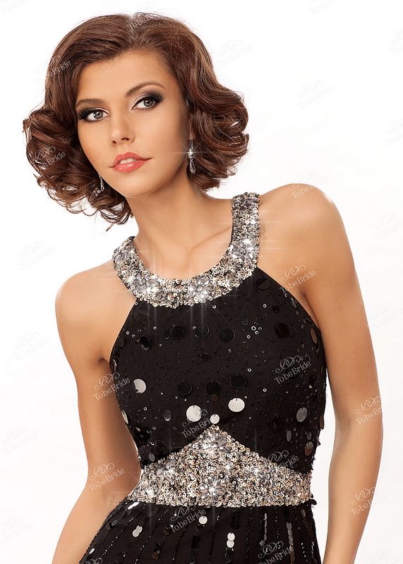 Лёгкое блестящее платье чёрного цвета. Крепится на овальной бретели, которая застегивается за шеей. Плечи максимально открыты.