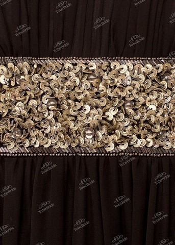 Лиф платья украшен многочисленными мелкими драпировками. Широкие бретели вышиты серебристыми и золотистыми пайетками и бисером. По линии талии (завышенной), проходит пояс, так же украшенный многочисленными блестящими декоративными элементами.