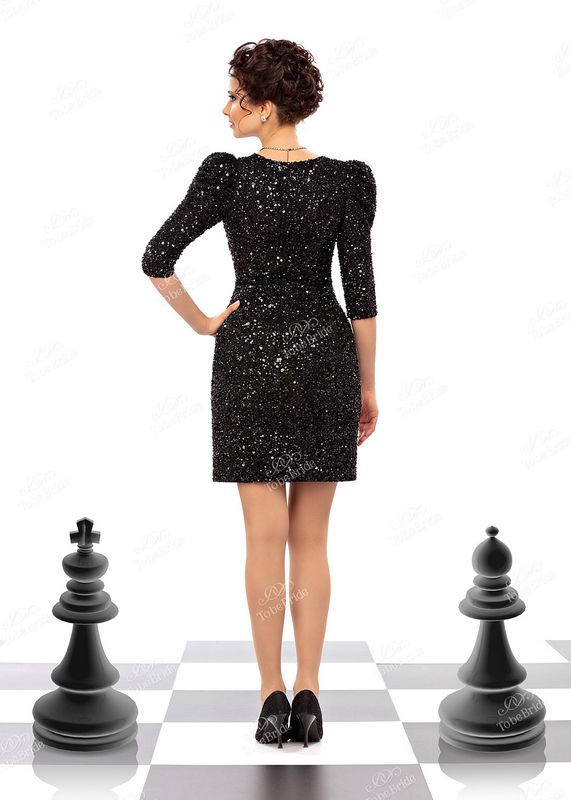 Сильное чёрное вечернее платье отличается огромным количеством пайеток, которые были использованы для его создания. Вырез горловины – овальный, рукава – три четверти. На плечах они объёмные, что помогает визуально «поднять» плечи.