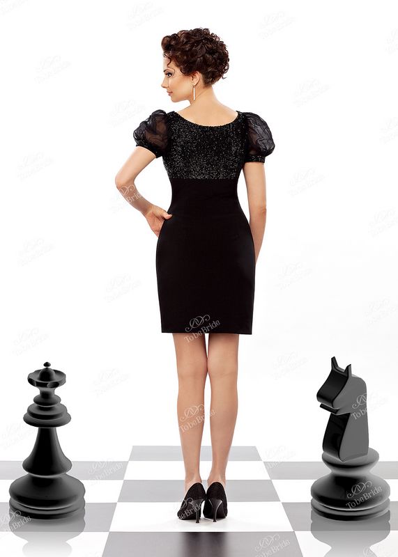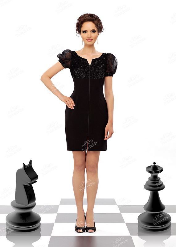 Верхняя часть платья вышита чёрным бисером, который очень красиво блестит при любом освещении. Рукава-фонарики выполнены из лёгкого прозрачного фатина чёрного цвета. Манжеты на рукавах так же вышиты бисером.