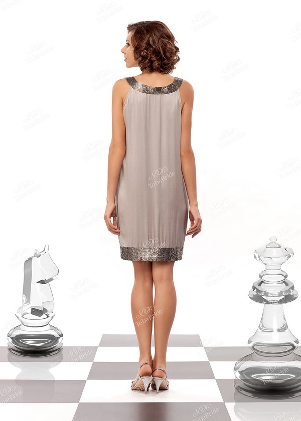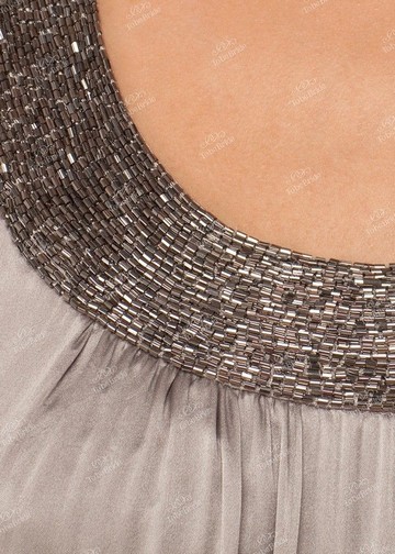 Платье прямое, не прилегающее. Вырез горловины спереди украшен широкой каёмкой, которая вышита серебристым бисером. Эта каёмка плавно переходит в две бретели, которые сзади так же сходятся на вырезе горловины.