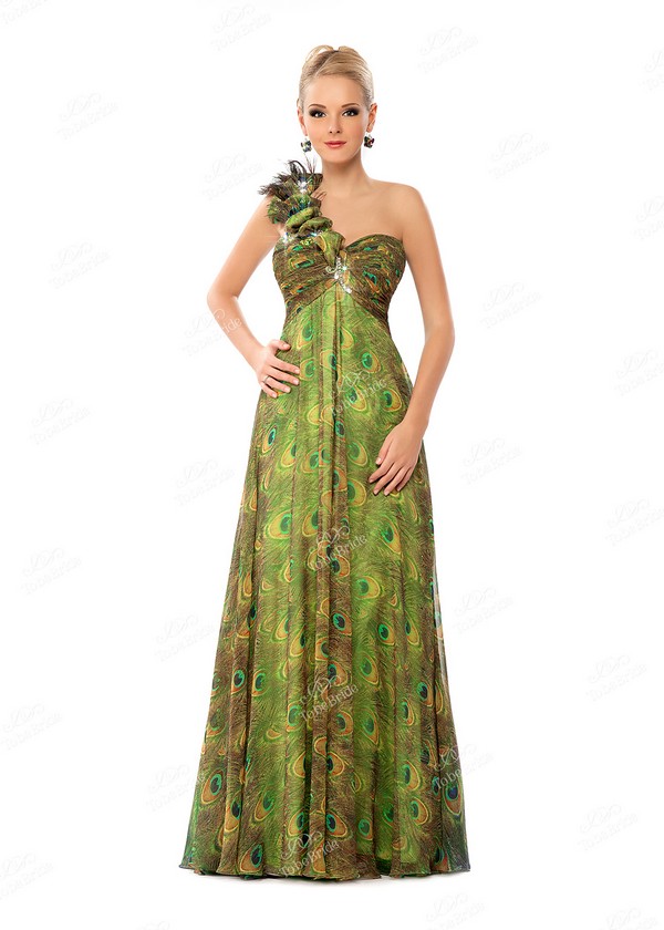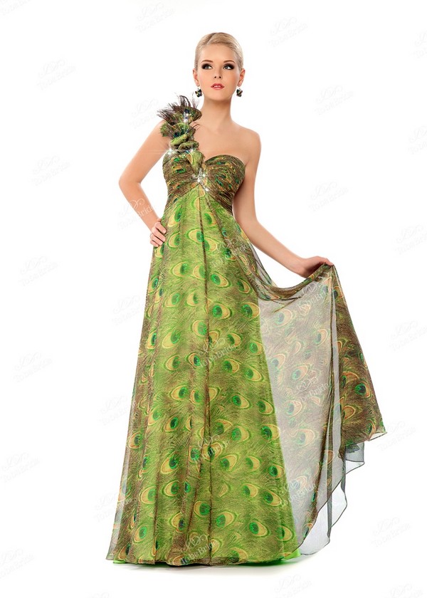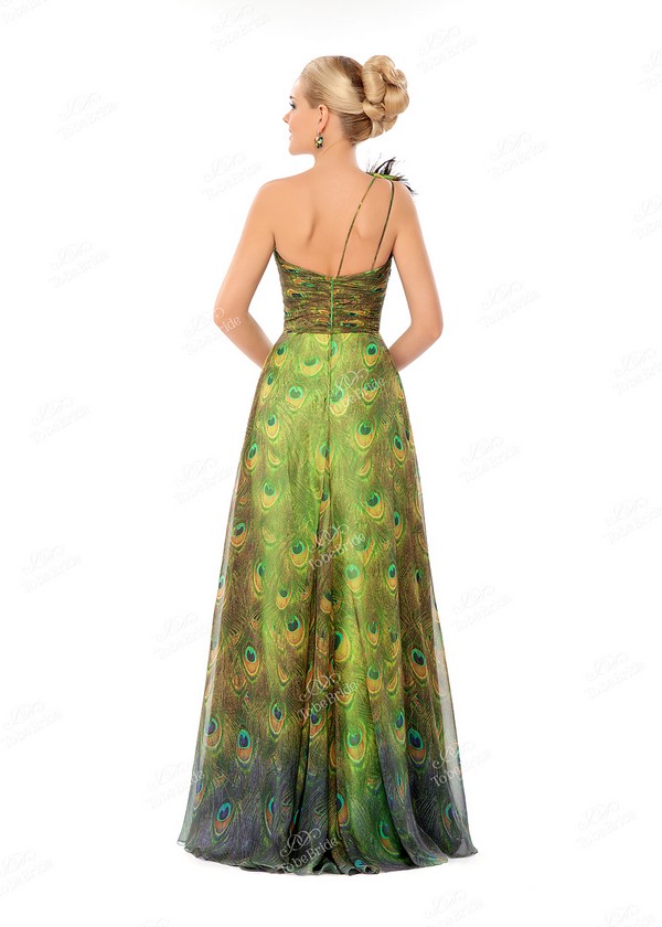 Необычное вечернее платье, созданное из лёгкой «летящей» ткани, отличается своей расцветкой. Словно тысячи павлиньих перьев соединились воедино, чтобы сотворить этот шикарный наряд.