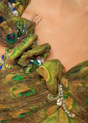 Широкая бретели, поднимающаяся на правое плечо, украшена несколькими перьями и воздушными складками ткани.
