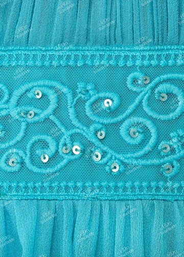 Романтическое и в то же время изысканно-темпераментное вечернее платье из воздушного шелка креп-жоржет чарующего небесно-голубого цвета. Эффектный фасон, в котором соединены ампир, а также нотки греческого стиля, создает восхитительный неповторимый образ. Изящная драпировка на лифе и декоративный пояс с изысканной вышивкой бисером и стразами в тон платью, придает образу особое очарование.