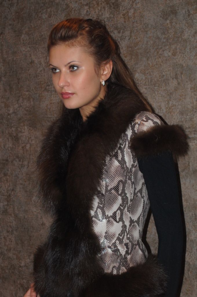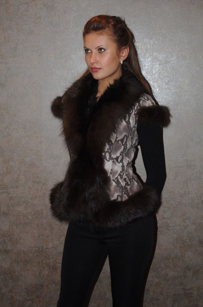 Уникальный меховой жилет, выполненный из натуральной кожи под змею, отделан шикарным мехом под соболя.