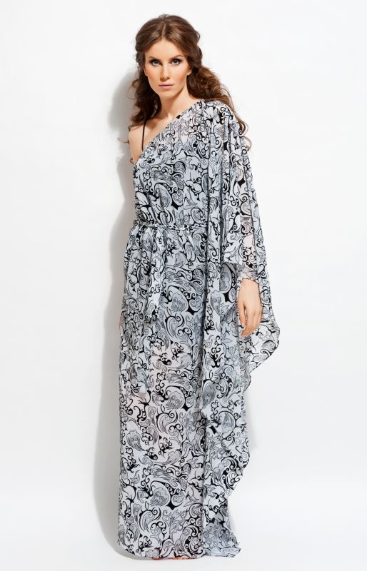 Покрой прямой, присобран на талии. Чрезвычайно тонкая бретелька смотрится очень женственно и кокетливо, открытое плечо напоминает одежду римской знати, полной достоинства и совершенства, поэтому платье предназначено для неспешного, с достоинством передвижения, а его обладательница будет напоминать богиню, достойную почитания и поклонения.