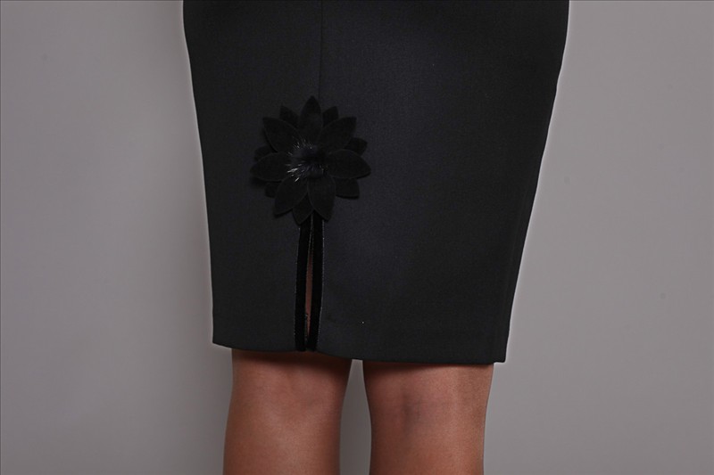 Благодаря красивому разрезу сзади, который украшен выбитым цветочком, эта модель смотрится потрясающе нарядно и красиво. Длина юбки – до линии колен. Она красиво прилегает к телу, делая ягодицы и бедра более округлыми.