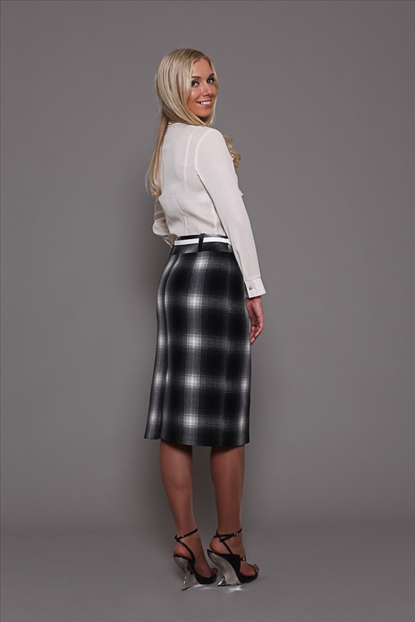 Длина юбки – чуть ниже линии колен. Отрезной пояс украшен белым тонким лаковым ремешком. Особенностью это модели является то, что её можно носить не только в осенне-весенний период, но и в зимние холода, так как ткань плотная и тёплая. Юбка хорошо сочетается не только с туфлями, но и с сапогами на высоком каблуке.