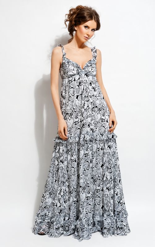 Ненавязчивый спокойный рисунок великолепной ткани с бархатом подчеркивает в Вашем облике царственное достоинство и красивую уравновешенность. Лиф открытый, с бретельками, украшенными небольшими воланами, подчеркивает прекрасную форму груди, а расширяющийся книзу силуэт сарафана, мягкими складками покрывает Ваше стройное тело.