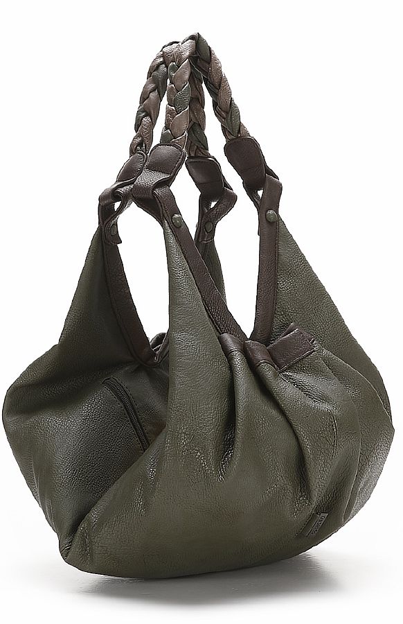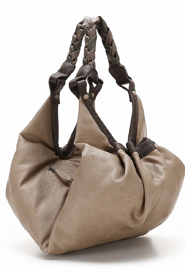 Благодаря уникальным разноцветным плетёным ручкам и удивительной мешкообразной форме сумки, она привлекает внимание и выглядит очень интересно. Сумка открывается по диагонали.
