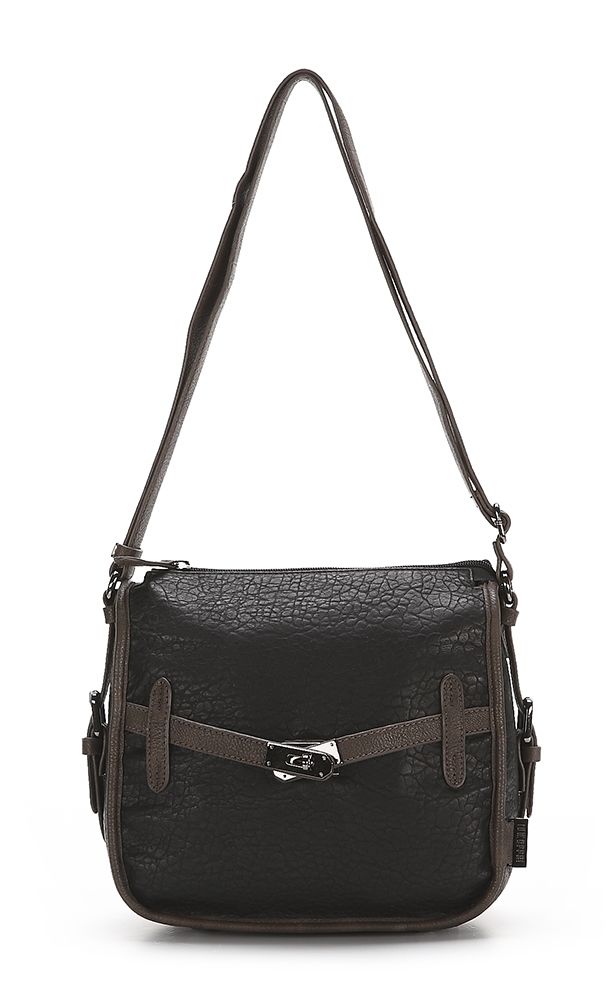 Сумка имеет прямоугольную форму, украшена несколькими вставками из цветных кожаных лоскутов. Застёгивается на металлическую молнию. В качестве элемента декора используется металлическая заклёпка, которая расположена в центре лицевой части сумки.